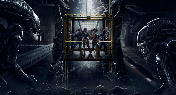 Alien: Descent was an immersive virtual reality attraction at The Outlets at Orange in Orange County, California themed around the Alien film series. The 4-player experience required each player to wear VR goggles, immersing them in an Alien environment, their movements tracked with sensors worn on the arms and legs. Players were armed with their own VR weapon+ that they could use to defend themselves from the threats they encounter.[1]