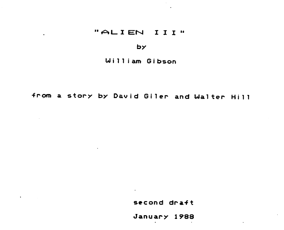 William Gibson's Alien III was a 1987 script draft for a sequel to Aliens.[1] Gibson was the first of ten different writers to tackle the Alien3 project, and his first draft screenplay is arguably the most well-known of the unmade scripts for the film as it has been available to read on the internet for many years. The story bears no relation to Alien3 as it was ultimately made, and instead revolves around Corporal Hicks and Bishop battling genetically-altered Xenomorphs aboard an enormous space station named Anchorpoint.