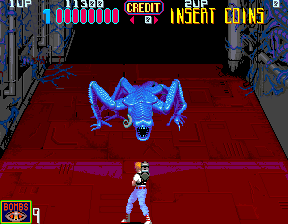 Aside from Drones, Queens, Facehuggers, and Chestbursters, Konami decided to make their own type of Aliens. They are unique, but also weird looking. Some of them can fly, others can shoot lasers and static electric rays, or even will grow when shot repeatedly and later explode. Some of them also resemble spiders. There are also infectoids, which reappeared in the AVP arcade game. One Alien type also had tentacles, and was encased in resin. Another could throw some harmful bubbles, which apparently contained Facehuggers. There's also a "spinner", which can spin and shoot bubbles of acidic spores.