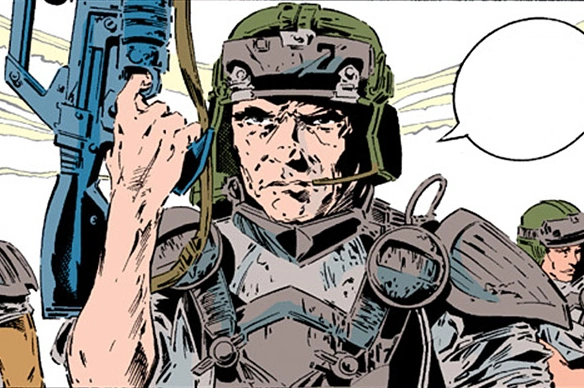 Beyond his military fatigues, during the exploration of the SunGun facility, he donned a comm headset and an EVA suit. On Bracken's World he wore a variant of the standard issue M3 Pattern Personal Armor and an M10 Pattern Ballistic Helmet for protection. He is equipped with an unidentified assault rifle equipped with an over-and-under grenade launcher and a variant of the standard issue M314 Motion Tracker.