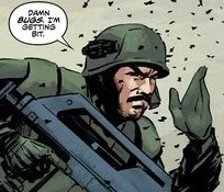 During their patrol, Chimo was constantly irritated by the planet's insects that constantly stung him, with Garland joking that they liked the taste of him. Garland suddenly pointed out that Chimo seemed to be getting bright spots from his stings. As Herrman took a closer look, it was revealed that they were the targeting laser of a Predator Plasmacaster. Chimo's head was suddenly blown to pieces as two Yautja, the Hive Wars Predator and Cracked Tusk Predator, emerged and slaughtered the remaining two Marines.