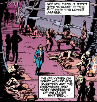 Blooded and better Yautja may take breaks from the hunt to enjoy the company of a female once they've earned the right to be considered for breeding. For Un-blooded and Youngbloods, they will often share one big communal living space during their down time, called "The Pit". In the Pit, young aspiring hunters can be seen cooking, stretching, talking, and even napping innocuously on bedrolls. Only high ranked Yautja have personalized quarters and hunting gear. Females are rarely seen hunting and are said to rule clans on their homeworlds. They also raise the young of the species for the first few decades of life.
