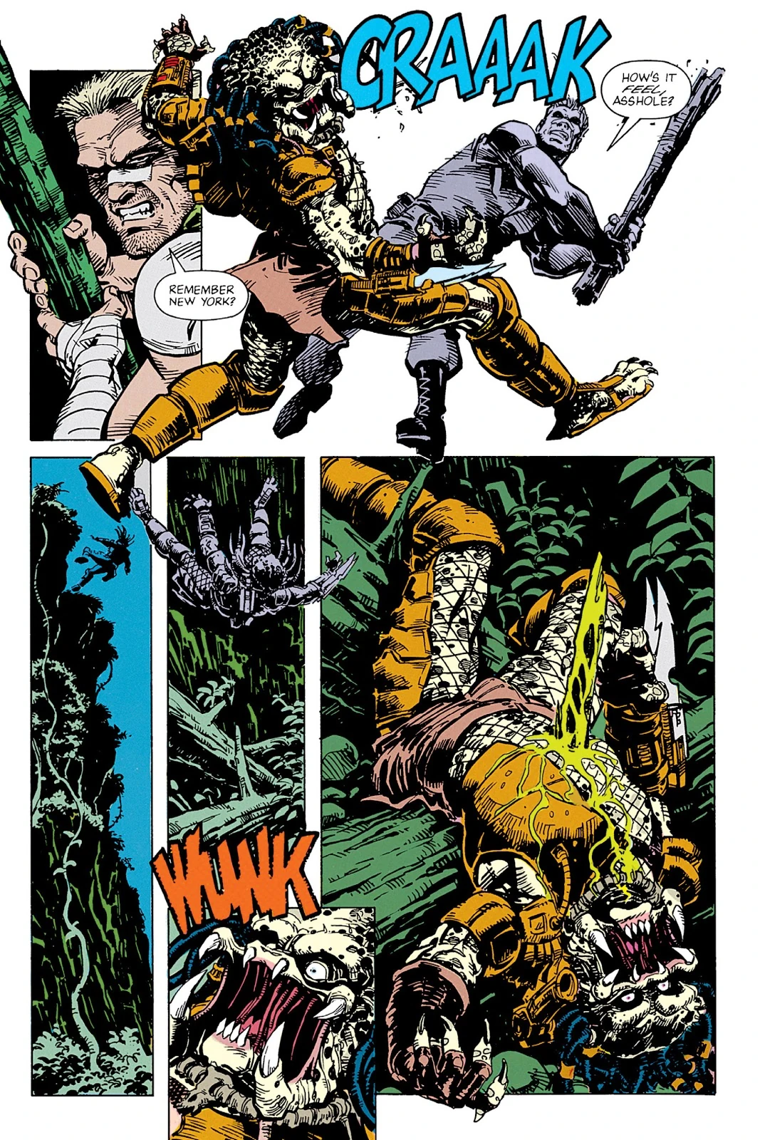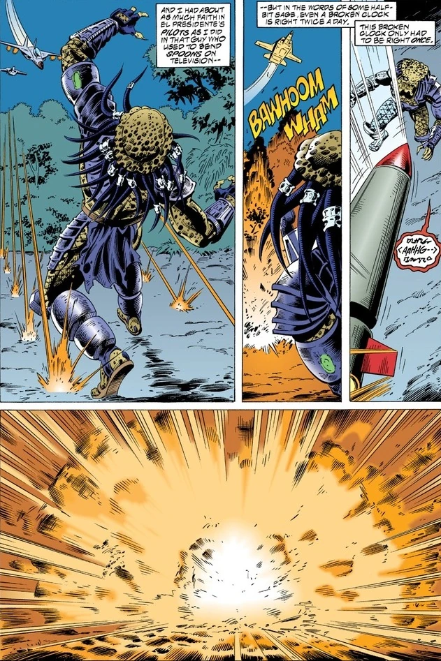 After a brief visit to the hospital, Schaefer travelled to South America to investigate and confirm the links with the murders in the city to his brother's disappearance. After setting up camp, he noticed that the New York assailant was nearby, and after narrowly missing a shot from its Plasmacaster, unloaded into the jungle, grazing the creature. The Predator emerged and began a melee with John. Though he was quickly overpowered by him, he broke a salt-shaker into the creature's face, temporarily blinding it. Grabbing a branch, he smashed it against the hunter, causing it to plummet from a cliff-edge and be impaled by a branch.