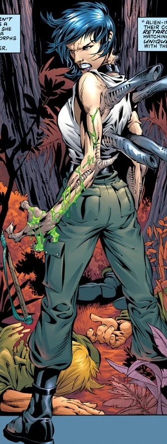 Eloise was an experimental, Vat-grown Xenomorph android prototype created by Doctor Fred Lichtner at the Adullam Facility on planet Sybaris 503. By infecting a Xenomorph egg with a biological computer virus using leprosy spores as a protective carrier medium, Dr. Lichtner was able to delete and rewrite specific DNA chains, causing the egg to grow into a humanoid android instead of a Xenomorph. Eloise wound up being an unexpected product of an early attempt at this, becoming a valuable asset to Dr. Lichtner in his studies of Xenomorphs, as well as his studies in dry leprosy and how the disease could somehow retard the final development stage of a Xenomorph embryo after it had been implanted in a human host. After the research facility was bought by the Adelaide and Bombay holdings Alliance however, a severely hostile takeover was enacted, save for Eloise who was deemed a worthwhile asset for the organization. Per her android nature, Eloise was at first willing to comply with her new Alliance masters, but when Xenomorphs and lepers began being killed, she experienced their pain and her Xenomorph Queen DNA asserted itself. Slaughtering countless Alliance personnel, Eloise led both surviving Xenomorphs and lepers against the Alliance.
