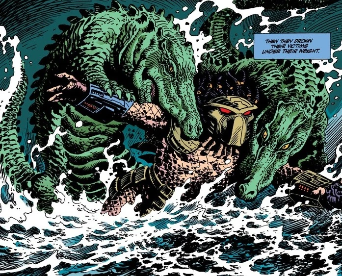 The Predator subsequently followed Copeland into a marsh, to which it was attacked by two giant Nile crocodiles. In the struggle, the Predator managed to kill both, at the cost of losing his left arm.