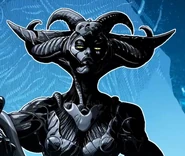 An enigmatic figure, the one in the dark was a biomechanical creature with vaguely feminine traits; she possessed a slender frame with elongated fingers. She also possessed curved horns that curled around her head.
