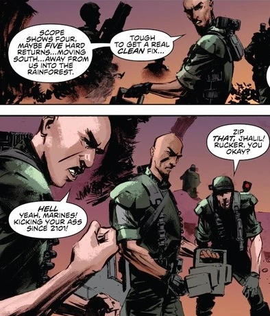 Paget later decided to send Roth and his team, consisting of Indelicato, Wearing, Jhalil, Freebody, Rucker, Singer, and Schrader into one of their dropships to fly over to the Juggernaut and secure the interior, whilst Paget's team approached the vessel by foot, attempting to sweep the forest using M314 Motion Trackers to flush out the hunters.
