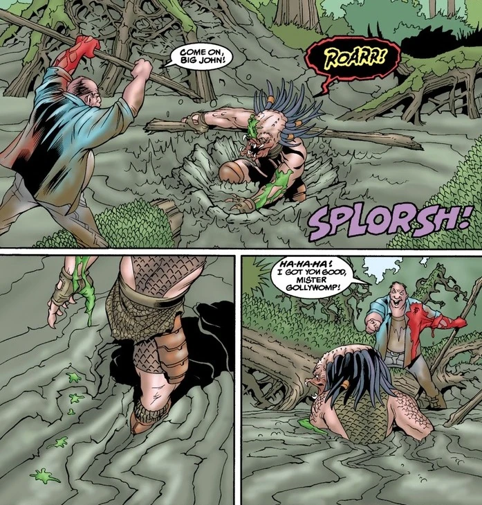 However, it is revealed that the creek was quicksand, and the 'Gollywomp' was shocked to realize that LeBlanc had tricked him into sinking into a sand trap. A triumphant LeBlanc mocked the creature as the Predator drowns, mimicking his laughter.