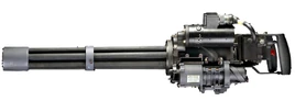 The M134 Minigun is an American-made six-barrel rotary machine gun chambered for the 7.62×51mm NATO cartridge. It features a Gatling-style rotating barrel assembly with an external power source, normally an electric motor, that allows for an incredibly high rate of fire (2,000 to 6,000 rounds per minute). The "Mini" in the name is in comparison to designs that use a similar firing mechanism but larger shells, such as General Electric's earlier 20-millimeter M61 Vulcan, and "gun" for the use of rifle ammunition as opposed to autocannon shells.