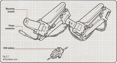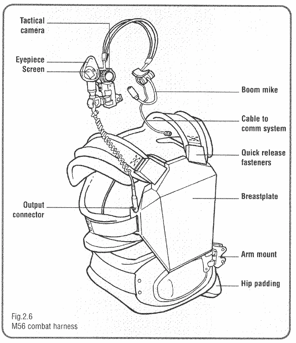 The M56 is securely attached to the operator by a stabilized articulation arm, attached to the left hip of the harness and connected via a coaxial cable the to processors and power outlets on the chest plate. The system's Head Mounted Sight is also connected to the tracking and communications systems in the chest plate. Power for the entire system is supplied by a standard DV9 lithium battery, plugged into the power leads that run from the articulation arm to the gun; removing this unit completely deactivates the weapon, rendering it useless.[7] Common practice in the field is to let the battery hang free beneath the gun where it can be easily accessed in an emergency.[3]