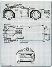 It was initially planned to build the film's APC entirely from scratch, and Ron Cobb developed a design for a wedge-shaped vehicle with four enormous wheels.[17] However, budget limitations meant the bespoke design was scrapped in favor of basing the APC on an existing vehicle; the donor vehicle chosen was a four-wheel drive, four-wheel steering, 635 hp Hunslet Air Towing Tractor, Model ATT77[18] used for towing aircraft, acquired from British Airways at London Heathrow Airport.[19] When it was first delivered it weighed 72 tons — aircraft tractors are deliberately massively ballasted to enhance traction — which was so heavy the vehicle would have fallen through the floor of Acton Lane Power Station, where the Hive scenes were filmed. As a result, the production crew had to remove 44 tons of lead ballast from the tractor.[19] James Cameron modified Cobb's original designs to fit the ATT77's frame before a metalworking firm in the town of Slough (near Pinewood Studios) constructed the vehicle's exterior shell.[20] The transformation was completed in less than two weeks. Top speed for the final vehicle was around 35 miles per hour. A remote-control miniature with a mechanized gun turret was also constructed for some scenes.
