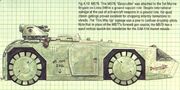 The M579 is an anti-aircraft platform based on the M577 in which the retractable roof turret is replaced with a quad mount housing four 20mm rotary canon.[14] Guided by a highly accurate multi-spectrum sensor, the AA turret can track and defeat even hypervelocity threats up to 1,500 m away by filling the sky around them with high explosive and armour-penetrating shells. Although intended for a strictly anti-aircraft role, the rotary canon can be employed (to devastating affect) against infantry on the ground, although such actions during the Linna 349 campaign drew fierce international condemnation.[15] In place of the M577's forward gun cupola, the M579 is also armed with a quad vertical launch bin housing SIM-118 Hornet ground-to-air missiles.[15]