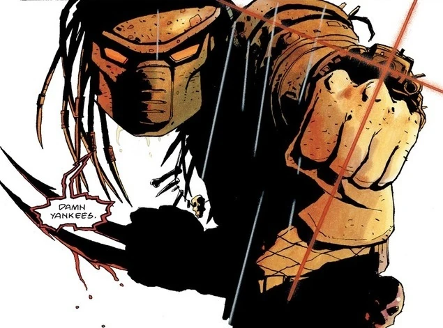 Hendricks was obliterated, but the Predator was left standing, and moved towards Dutch. As he prepared to stand off against it, it was suddenly impaled from behind with the Union flag by Jesse. The survivors looked over the dying creature, who taunted them with a "damn yankees", before being killed by James with a shot to the head.