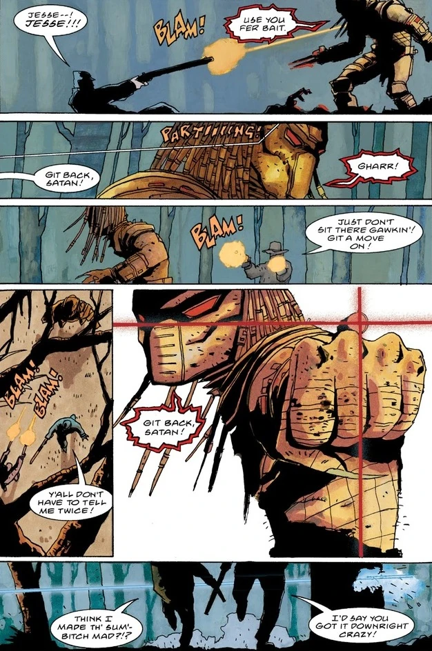 James, alongside his comrades Standing Bear and Nebediah eventually reached the Confederate camp, only to witness first-hand the results of the Predator's massacre. James believed it to be the work of Union soldiers. After ambushing a passing unit of Union soldiers, who were transporting a stationary cannon, the three began discussing what possibly could have killed their men. Standing Bear told stories of a Cannibal Spirit that left its cave deep within the Ozarks and feasted on human flesh. Though Jesse was sceptical, Neb partly agreed with him, telling a story of how the Devil had allowed a mountaineer to invite him into his solitary log-cabin, slaughtering and cannibalizing him, his family and burning the cabin to the ground. Hearing enough of their ghost stories, Jesse departed from the two to check on the canon, only to notice a distant silhouette of a creature. The two locked gazes for a moment, and Jesse suddenly returned to the group in shock to notify them on what he has seen.