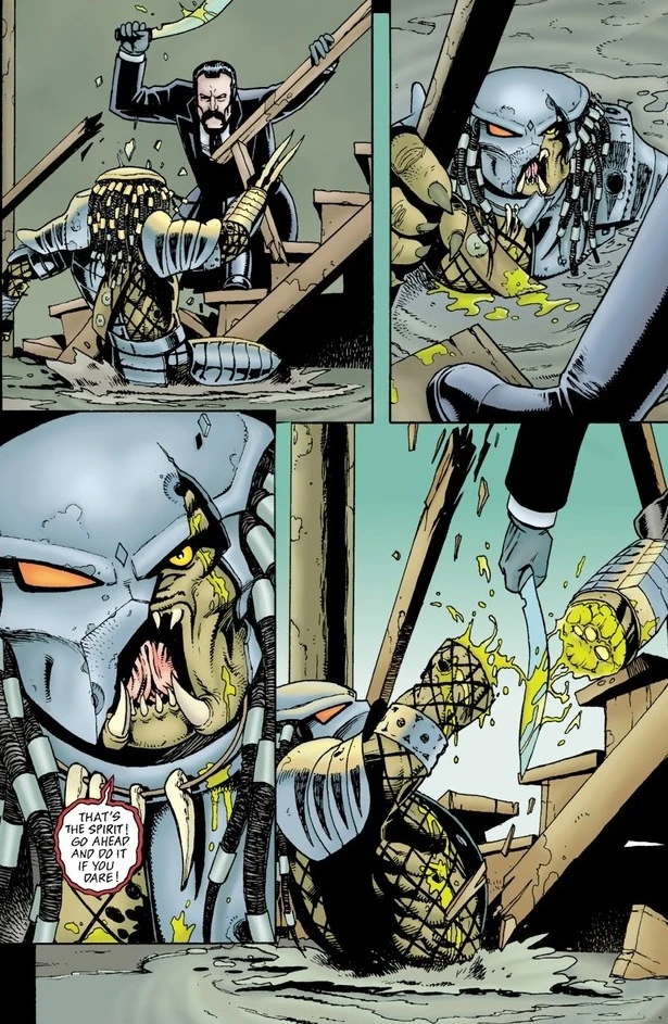 Soames retreated, luring the Predator into a nearby mud-pool. After goading the creature, the Predator followed suit, but Soames, now possessing the high ground on a set of stairs, swiftly sent the hunter into the mud-pool after a brief melee. The Predator desperately held onto a wooden railing, but Soames cut it's arm off with a kukri-knife he had acquired. The hunter slowly drowned in the mud-pool before the river tide came in, likely finishing the creature off for good.