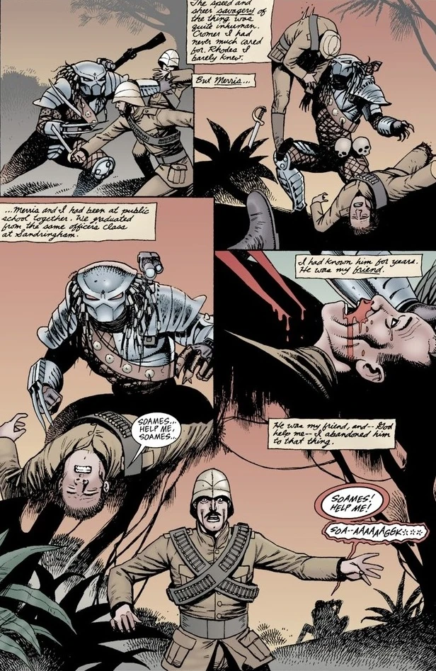 Fifteen years after the incident. The Predator began a killing spree in the city of the London, garnering the pseudonym 'Spring-Heeled Jack'. At some point the hunter raided a local bar in Whitechapel and massacred all inhabitants, leaving only a young Indian boy alive. Soames later became an agent and was tasked by the elusive Diogenes Club to track and eliminate the serial killer. After investigating the scene of the crime, Soames was distressed to realize that the culprit was the same one he encountered in Bengal fifteen years ago.