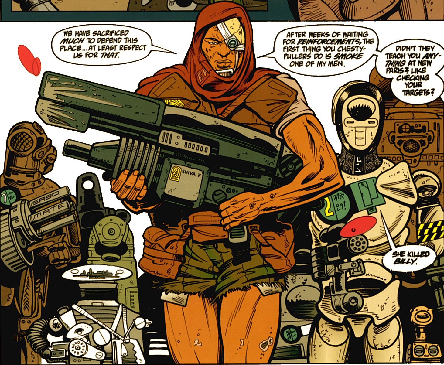 After recently defending the group from an alien attack, the shop steward and the group was visited by a marine squadron, seeking the weapons he was originally set to defend. As the marines explored the area, the marine, Chen, unhinged and high on Royal Jelly accidentally shoots one of the shop steward's closest robot companions, Billy. The shop steward greets the squad by scorning their undisciplined nature and angrily choked Chen. Beliveau eventually ordered him to refrain and he complies with helping the marines.