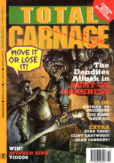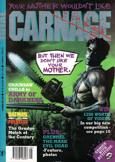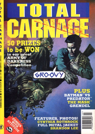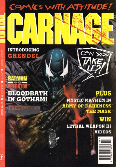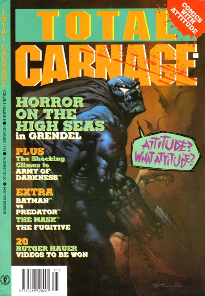 Total Carnage was designed to showcase some of Dark Horse's more violent and edgy stories, with taglines such as "Comics with Attitude!", "Your Mother Wouldn't Like Total Carnage" and "Not for Kiddies". Among the comics featured were Grendel, The Mask and the comic adaptation of Army of Darkness by John Bolton.[1] The magazine also featured serialized reprints of Predator and Aliens vs. Predator comics; prior to the launch of Total Carnage, UK reprints of these stories had featured in Aliens magazine, but as that publication's focus shifted exclusively to the Alien franchise, Predator and AVP titles found themselves in need of a new home. As a result, they were added to the roster of comics to be featured in the newly-launched Total Carnage. Several issues of the magazine also featured Predator and AVP cover artwork, all of which was recycled from existing comics and other publications.