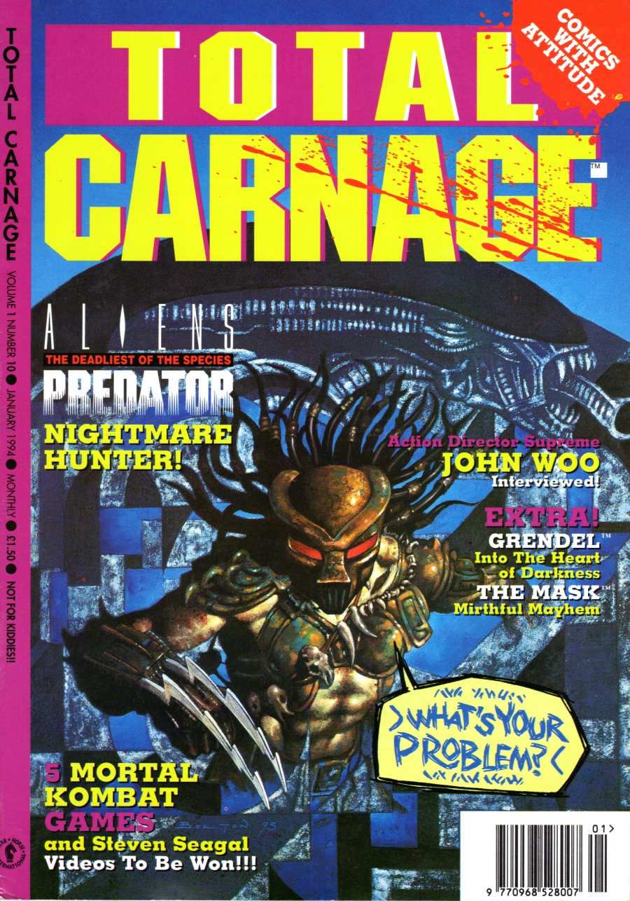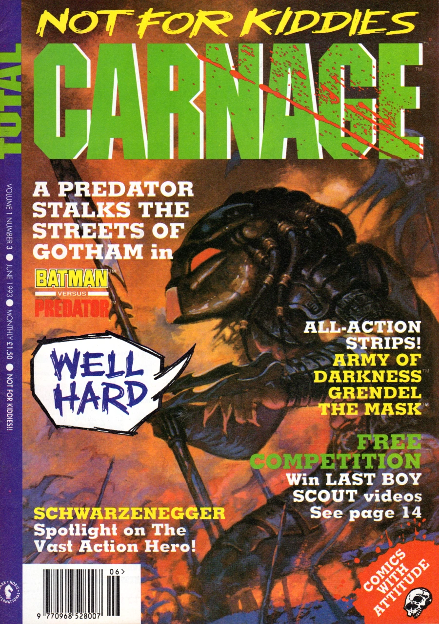 Total Carnage is a 48-page "oversized" (8½ × 12) format anthology comics magazine that was published in the United Kingdom by Dark Horse International from April 1993-January 1994. Like Dark Horse International's other UK publications, the magazine featured serialized reprints of existing Dark Horse comic books for the UK market, along with articles, news and interviews. Notably, it was home to reprints of Predator and Aliens vs. Predator comics after both were moved out of Aliens magazine.[1]