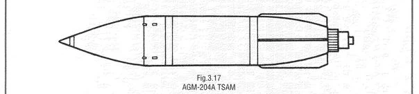 The TSAM (Threat Suppression Attack Missile) is a low-cost self-protection weapon designed to defend against airborne missiles, early warning radars, SAM sites and anti-aircraft artillery. Small, short ranged and lightweight, the TSAM design trades off the loiter mode of most modern threat suppression missiles in favor of speed, in order to eliminate a threat rapidly.[11] The Tekell solid motor is a high impulse unit capable of accelerating the missile to hypersonic speeds in less than two seconds; after burnout, the missile coasts to the target. Range is highly variable dependant on launch speed and altitude, although practical limits in an Earth-density atmosphere are 20 km at sea-level, increasing to 60 km at high altitude. While mounted on its pylon, the TSAM is linked to the dropship's ATLIS threat response system, which can automatically launch a missile the moment an enemy radar, missile or guidance laser threat is detected.[11] The weapon itself contains a passive seeker suite consisting of a wide-band superheterodyne receiver cluster with frequency coverage ranging from the VHF/UHF to the millimeter-wave bands, switching to a millimeter-wave radar for terminal homing, giving the missiles a secondary ground attack capability against non-radiating targets.[11]