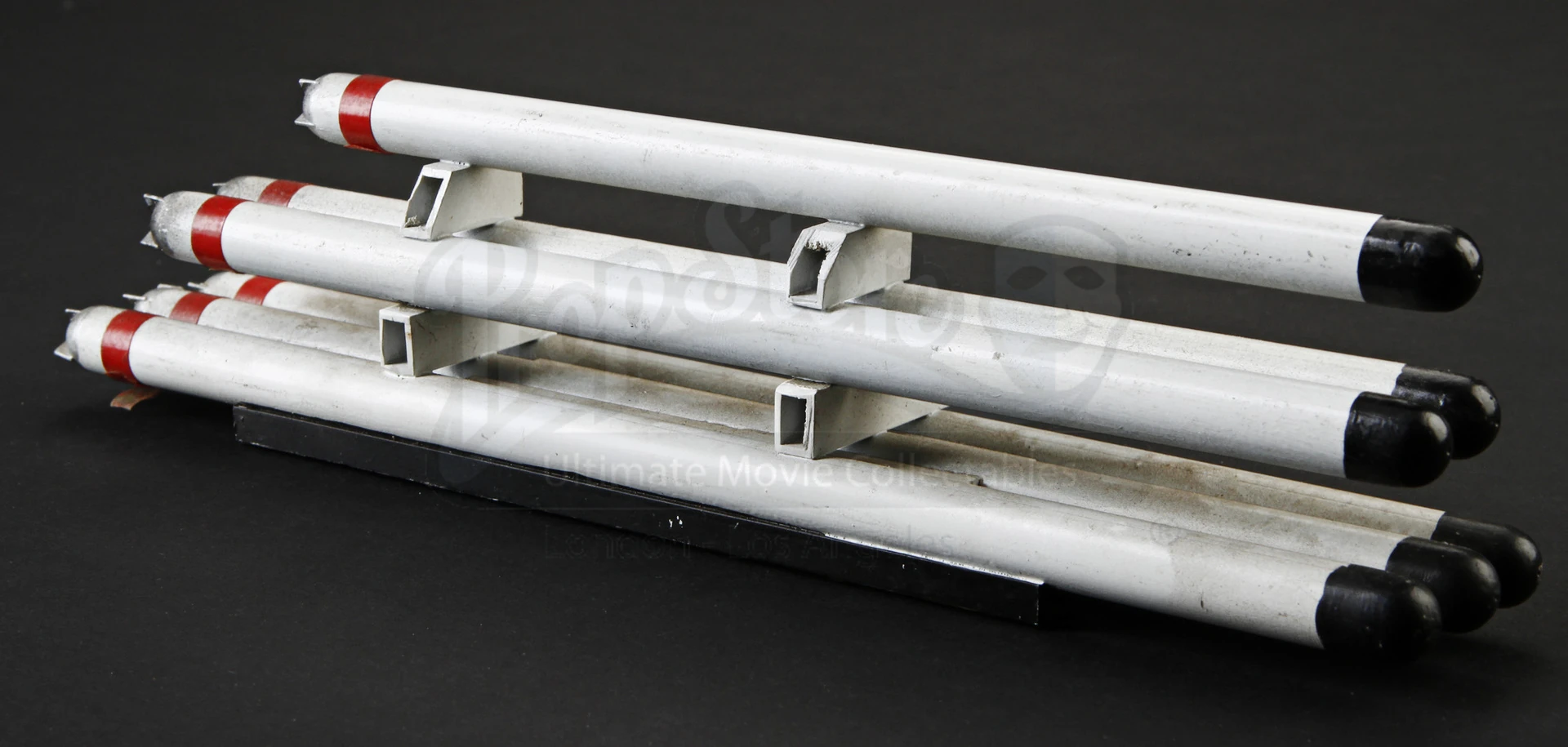 This item is part of the miniature used during filming, and consists of the dropship's left wing Mk.10 Zeus rockets. Made primarily from model plastic, these rockets rest on beveled wood and were once mounted inside of the dropship's left rocket pod. Each rocket has been painted with the body tube being white, the nose cone jet black, and the launch engine grey in color. Wrapped around the back of each rocket is a small strip of red tape. The bottom of the miniature features two long strips of wood that have been cut to appear like unistrut, which feature remnants of glue from being attached to the rocket pod.