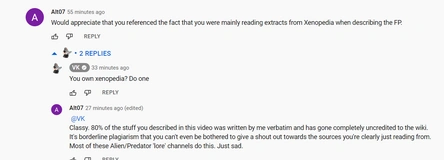 Got another esteemed Alien/Predator 'lore' channel that seems to just be reading Xenopedia extracts without credit. Named 'VK'.