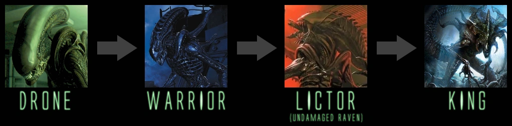 ADDENDUM - As pointed out to me by Freighttrain, The, it perhaps would make more sense for the Lictor (in his headcanon he has renamed the Raven as the 'Vanguard' caste instead, as well as renaming the Royal Guard - juvenile Praetorians - as Lictors) to come from a Lurker instead of a Warrior.